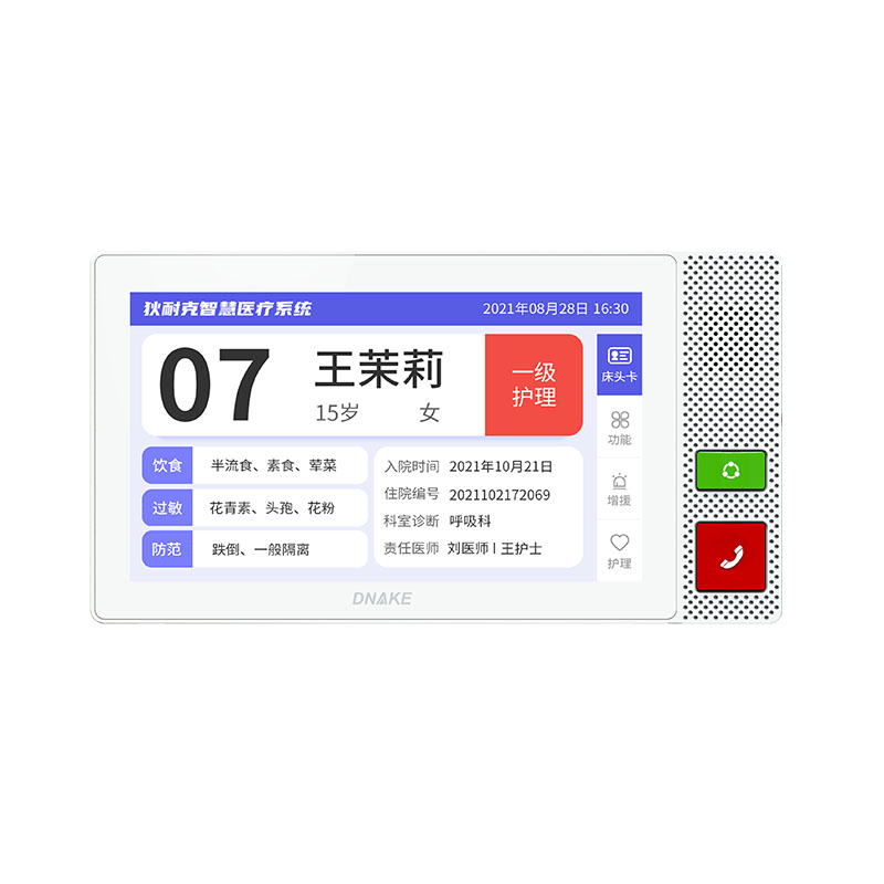 安裝在病床頭的交互設(shè)備機(jī),代替?zhèn)鹘y(tǒng)紙質(zhì)卡。產(chǎn)品支持呼叫對(duì)講、為住院患者提供病例查詢、狀態(tài)自動(dòng)提醒等護(hù)理需求等。