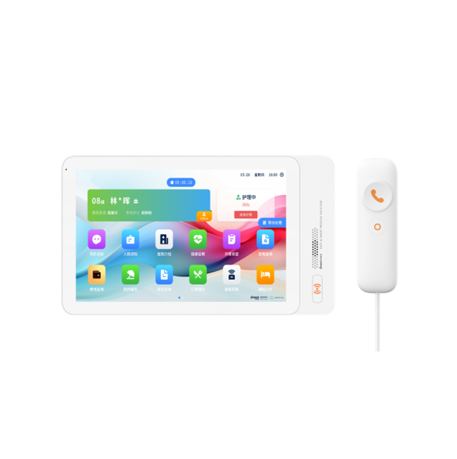 安裝在病床頭的交互設(shè)備機(jī),代替?zhèn)鹘y(tǒng)紙質(zhì)卡。產(chǎn)品支持呼叫對(duì)講、為住院患者提供病例查詢、狀態(tài)自動(dòng)提醒等護(hù)理需求等。軟件參數(shù):1)采用多點(diǎn)觸控電容觸摸屏,超薄面板,含手持呼叫手柄,安裝在病床上方的多功能擺臂上,每個(gè)病床一臺(tái),用于呼叫護(hù)士站,患者基本信息展示。2)支持呼叫/解除:可向護(hù)士站主機(jī)呼叫與解除呼叫。3)支持對(duì)講:可與護(hù)士站主機(jī)、病房門口機(jī)對(duì)講。4)電子床頭