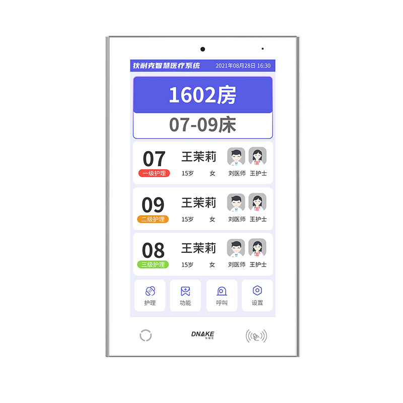 設(shè)置在病房門(mén)口的終端設(shè)備,主要用于顯示病房相關(guān)信息,內(nèi)置簡(jiǎn)易醫(yī)護(hù)工作站,支持病房床位一覽、患者動(dòng)態(tài)跟蹤、呼叫對(duì)講、增援求救等多種呼叫類(lèi)型,信息齊全,及時(shí)響應(yīng)醫(yī)護(hù)需求,實(shí)現(xiàn)智能化醫(yī)護(hù)管理。