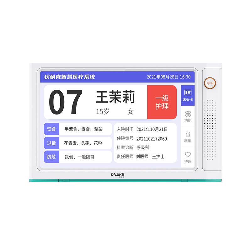 安裝在病床頭的交互設(shè)備機(jī),代替?zhèn)鹘y(tǒng)紙質(zhì)卡。產(chǎn)品支持呼叫對(duì)講、為住院患者提供病例查詢、狀態(tài)自動(dòng)提醒等護(hù)理需求等。