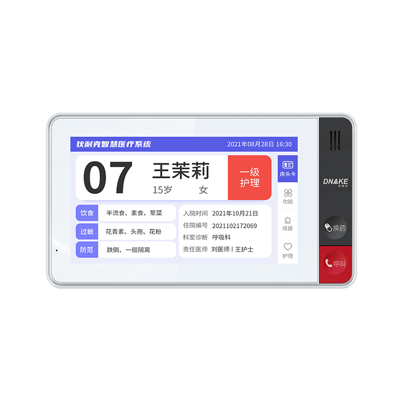 安裝在病床頭的交互設(shè)備機(jī),代替?zhèn)鹘y(tǒng)紙質(zhì)卡。產(chǎn)品支持呼叫對講、為住院患者提供病例查詢、狀態(tài)自動提醒等護(hù)理需求等。